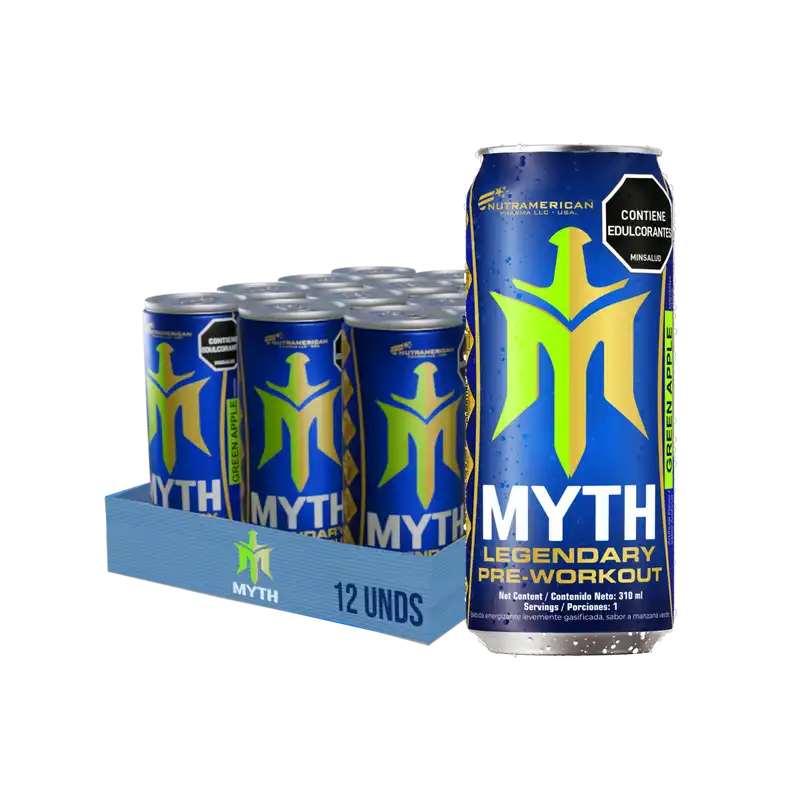 MYTH, es una innovadora bebida energizante pre-entreno desarrollada, con delicioso sabor a manzana verde y ligeramente gasificada.